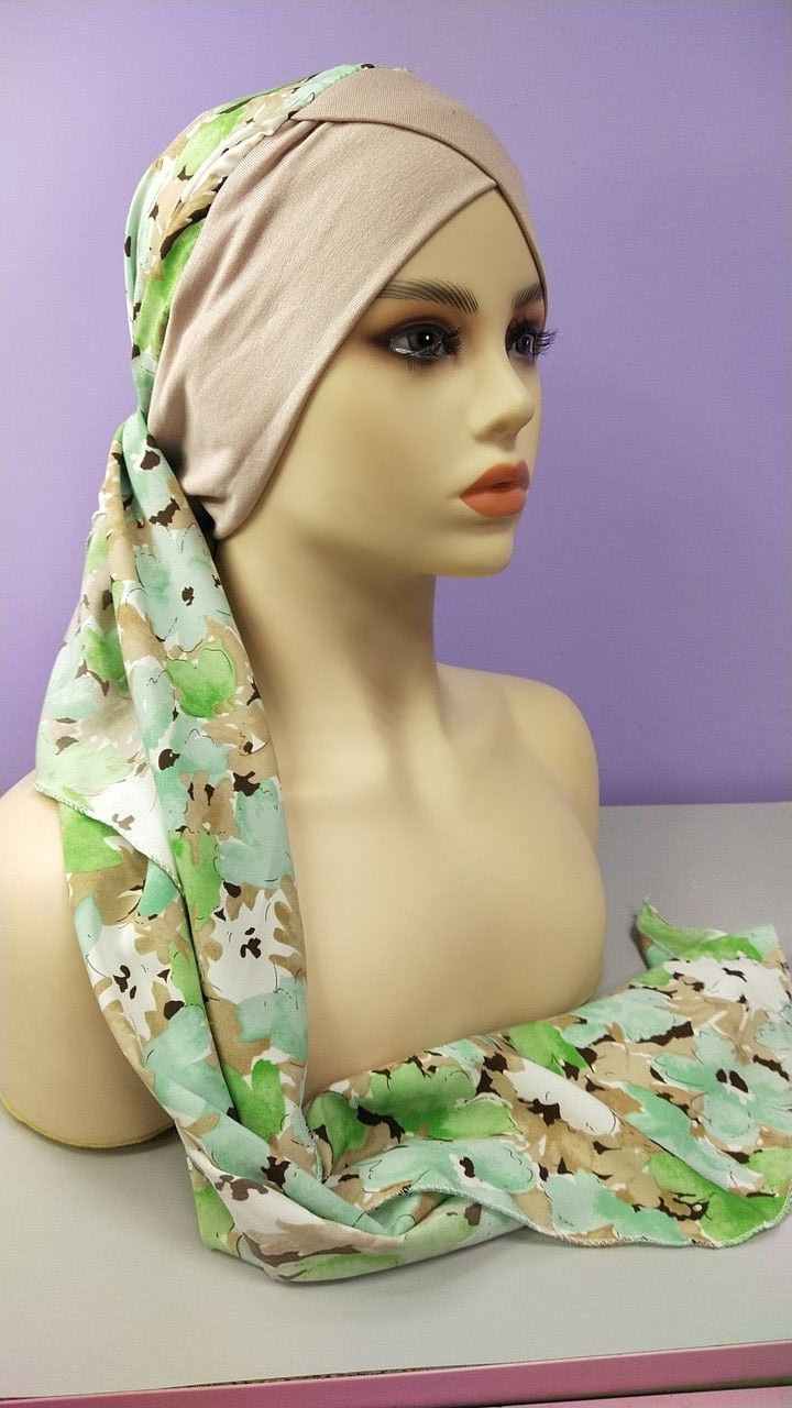 Чалма шапка 54-60 рр французская вискоза на пов'язці трикотажній бежева з бірюзовим і коричневим візерунком літня "Вуалька"